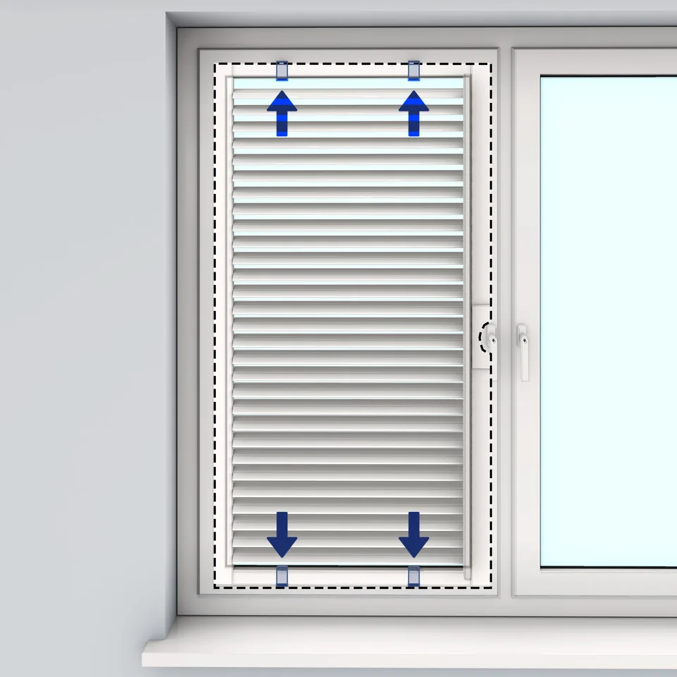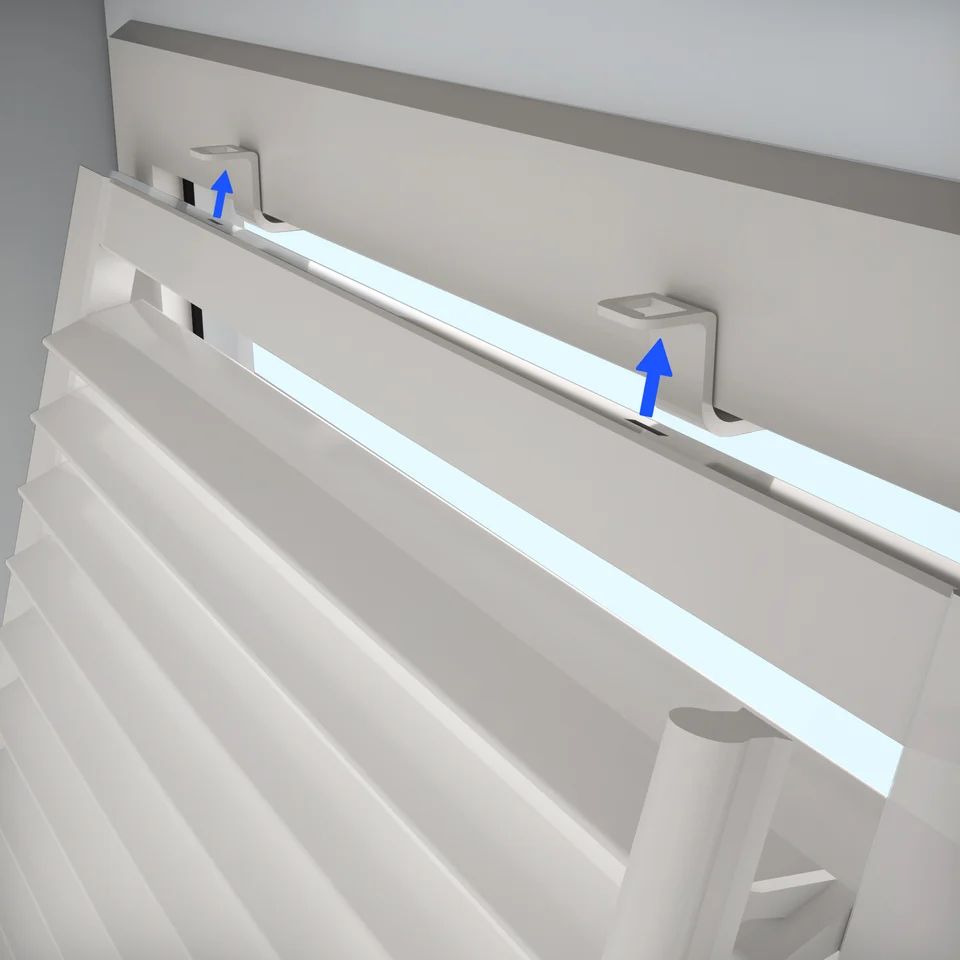 Brackets slide behind the rubber glazing bead. The shutter panel clicks on from the front. No wall damage, no filler, no making good afterwards.