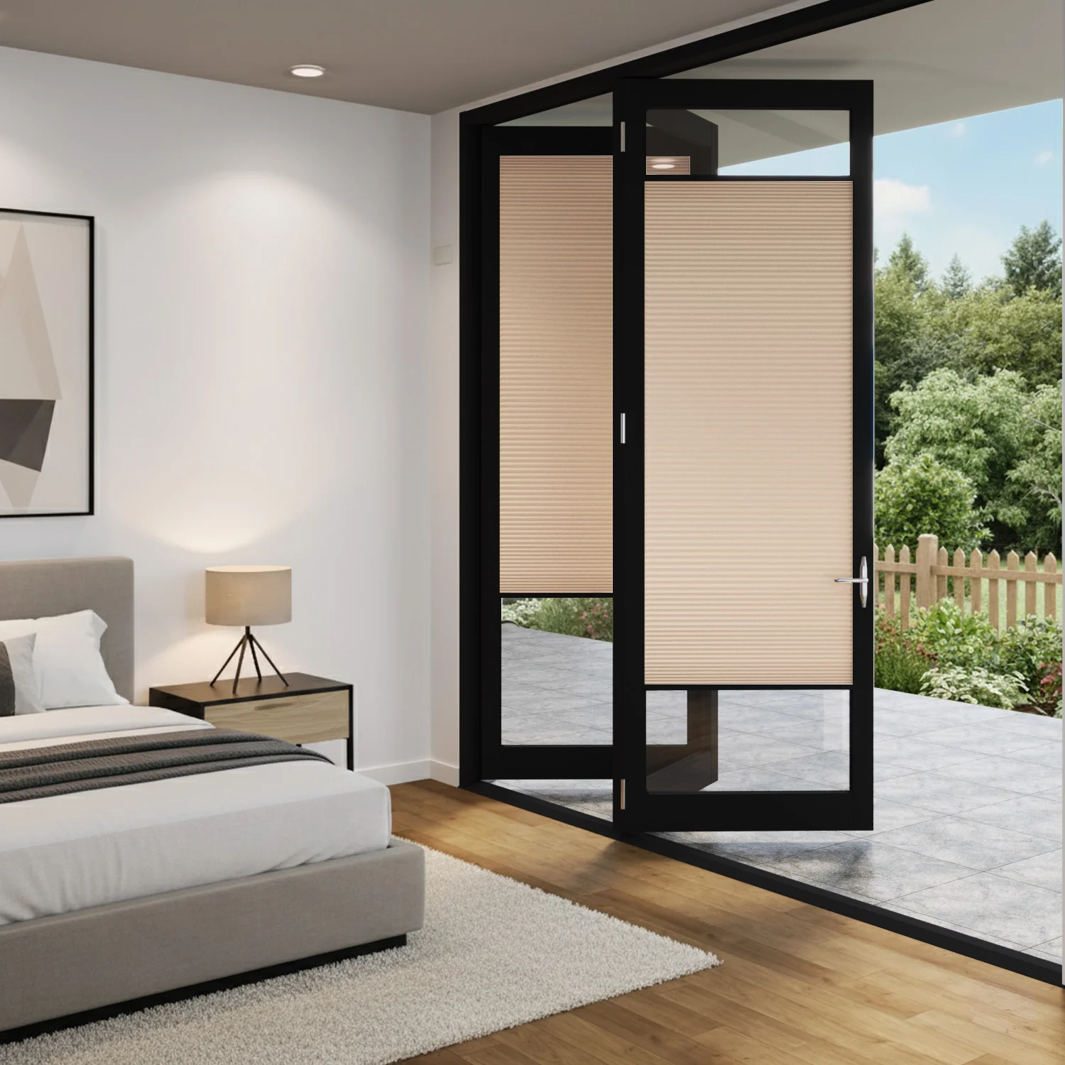 Bring superior light control to your bifold and French doors with CosiBLOC Dune blinds. Each door panel receives its own individual blind that operates independently as doors open and close. The streamlined 32mm profile from glass to handle maintains smooth door operation without interference. The natural dune finish complements both timber door frames and light-coloured uPVC beautifully, whilst the blackout fabric provides substantial light reduction without compromising your connection to outdoor spaces when doors are open.