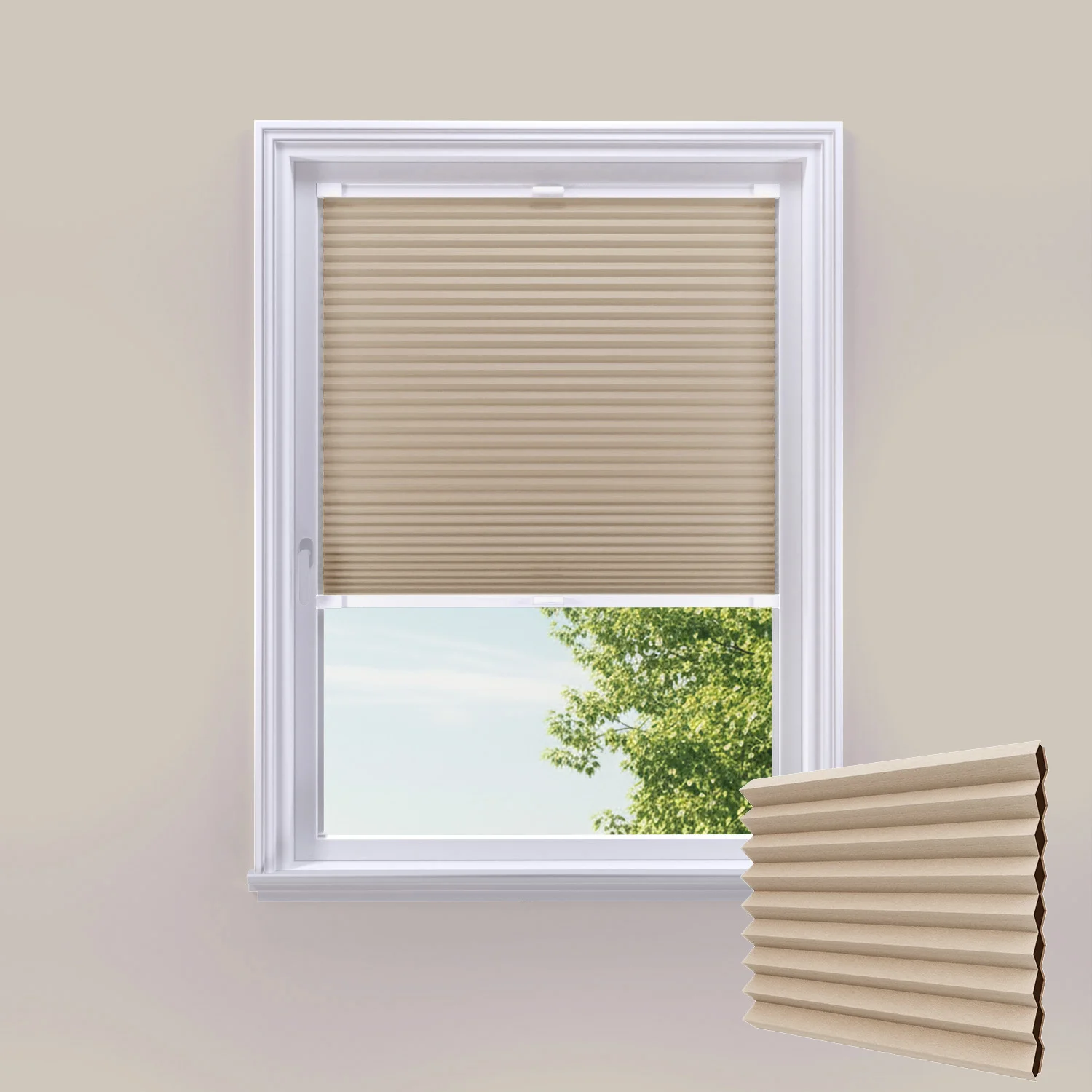 Experience serene light control with CosiBLOC Dune stick-on blackout cellular blinds. No drilling required, 100% child-safe, and perfect for creating tranquil bedroom sanctuaries. Soft dune beige honeycomb design with blackout fabric that blocks light transmission through the material, while providing exceptional thermal insulation and natural coastal elegance.