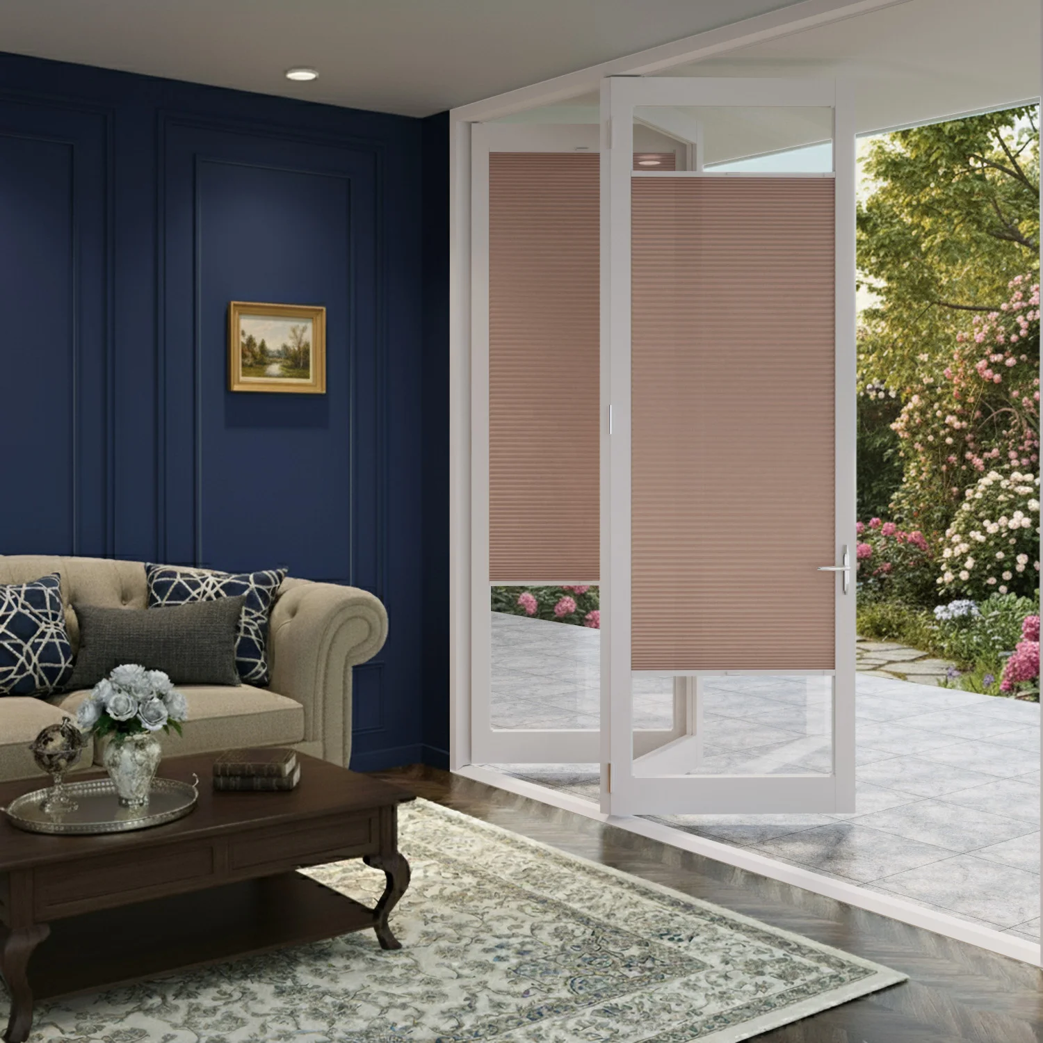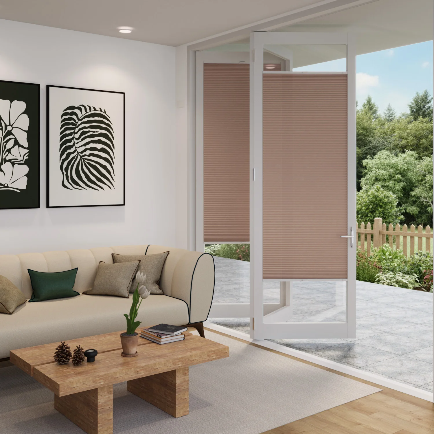 Transform your bifold and French doors with CosiSHADE Brown blinds. Each door panel receives its own individual blind, moving independently as doors open and close. The slim 32mm profile from glass ensures smooth door operation without interference. The warm brown tone adds natural character to glazed doors while the light-filtering fabric maintains privacy without blocking your connection to outdoor spaces.
