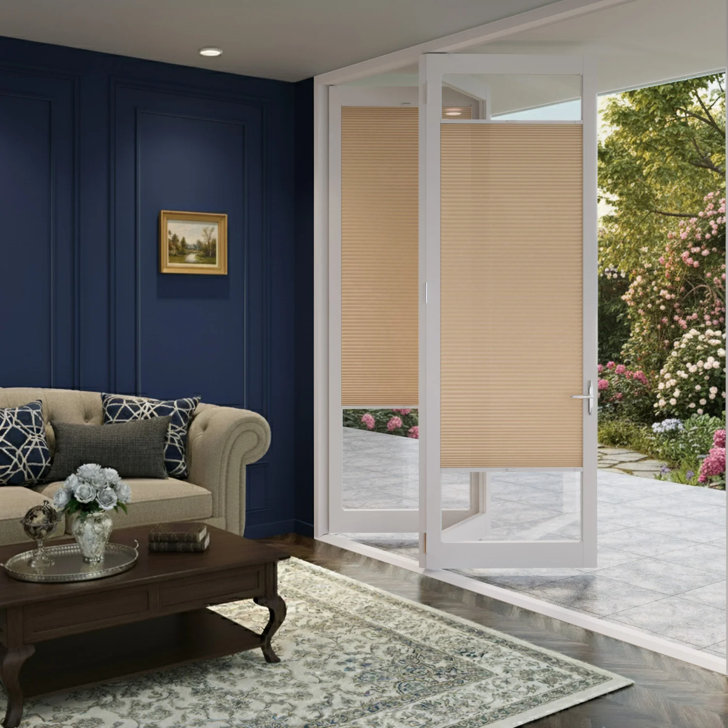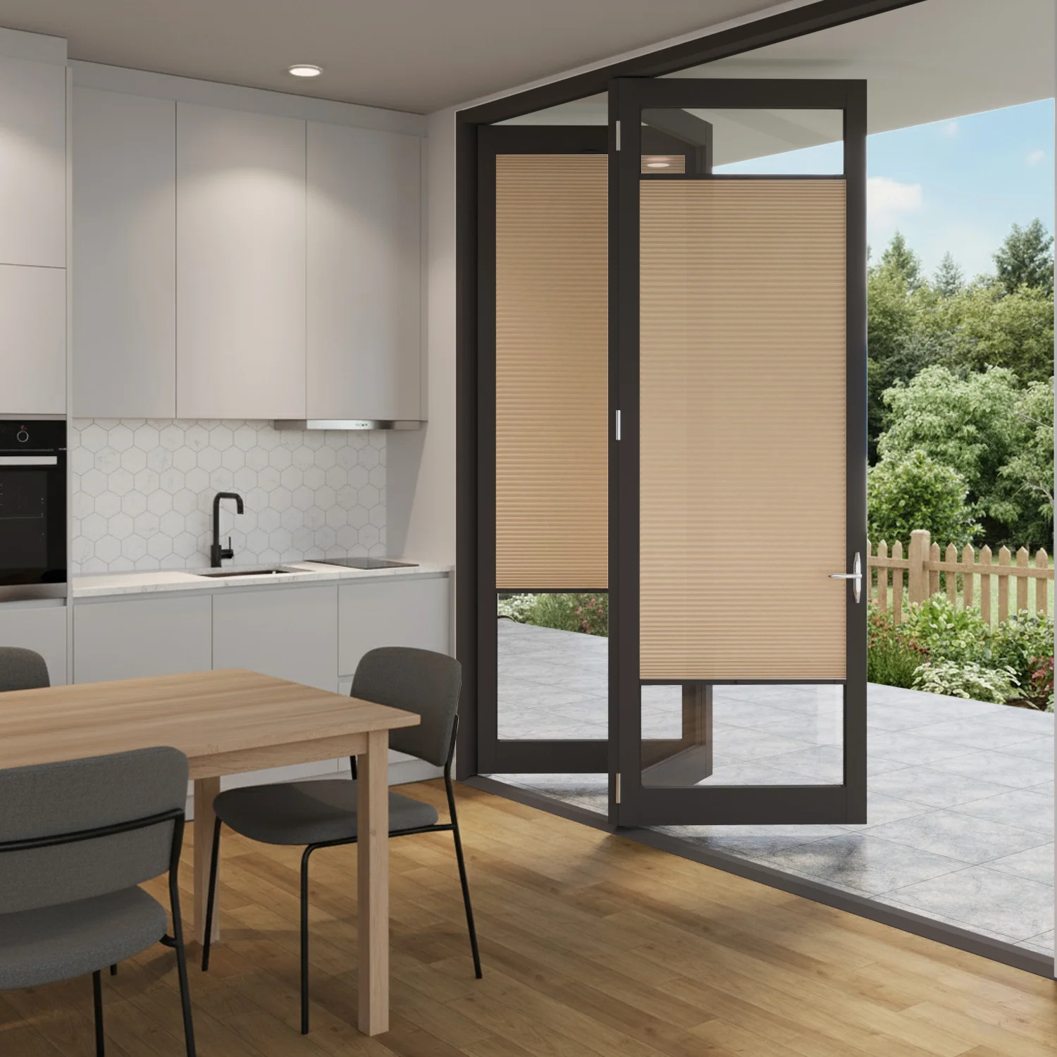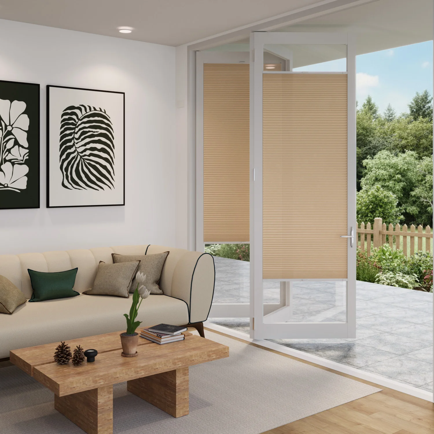 Transform your bifold and French doors with CosiSHADE Dune blinds. Each door panel receives its own individual blind, moving independently as doors open and close. The slim 32mm profile from glass to handle ensures smooth door operation without interference. The warm sandy beige tone complements both traditional timber and modern aluminium door frames, while the light-filtering fabric maintains privacy without blocking your connection to outdoor spaces.