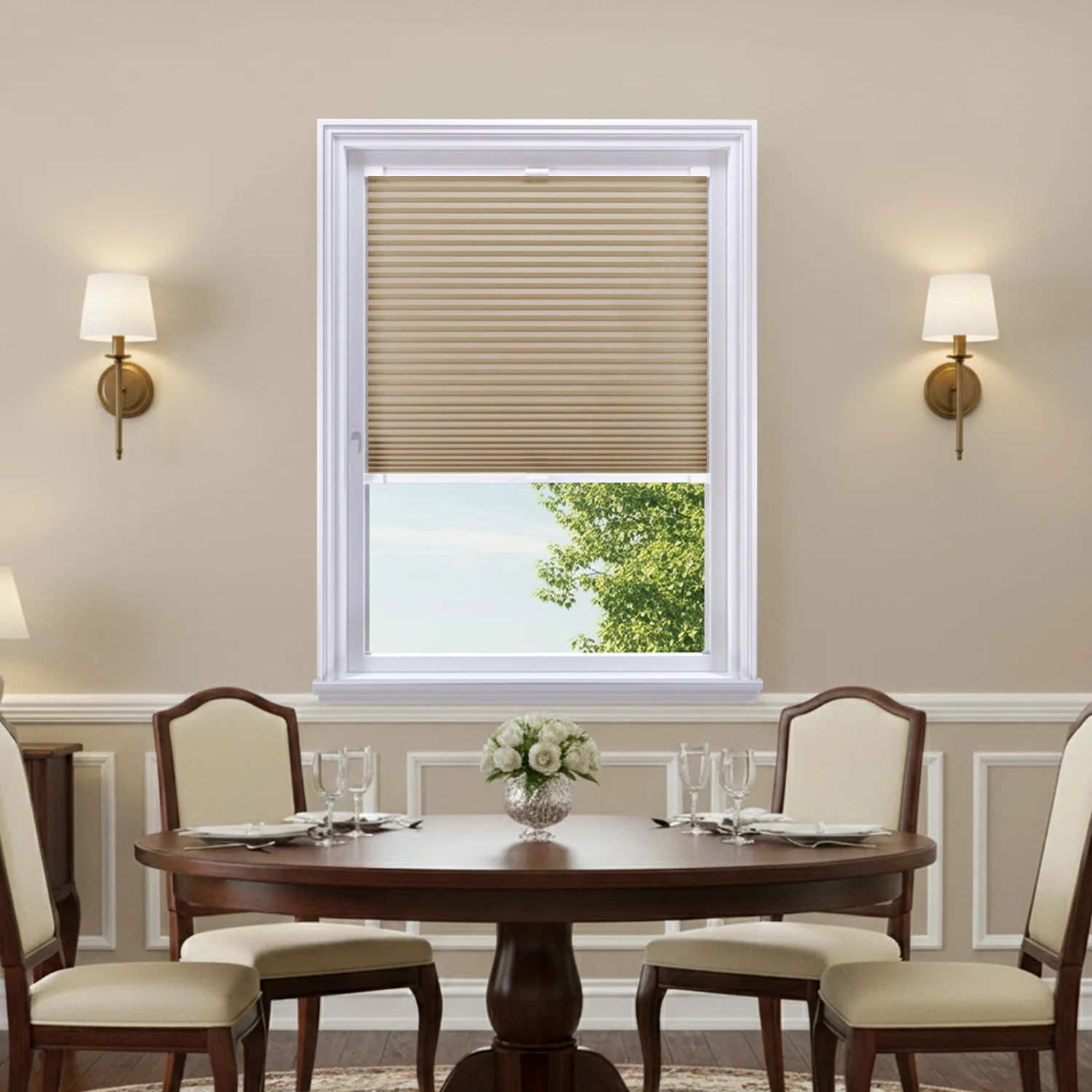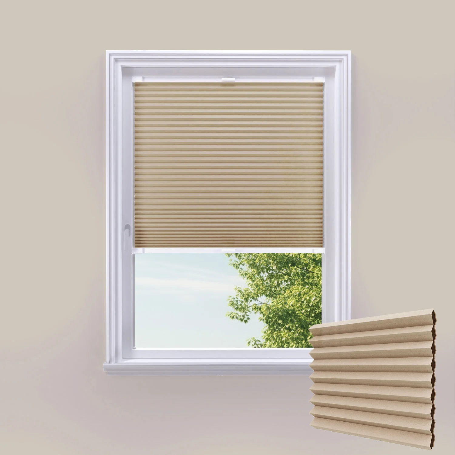 Transform your windows with CosiSHADE Dune stick-on cellular blinds. No drilling required, completely child-safe, and ideal for any window or door. Energy-efficient honeycomb design with superior privacy control and sophisticated sandy beige tone.